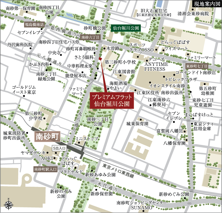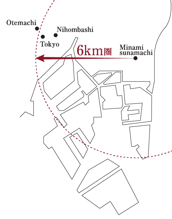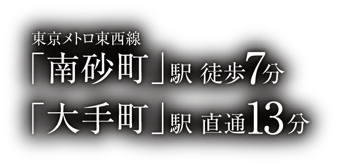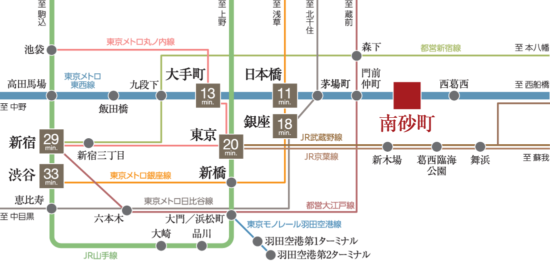 【日本橋】「南砂町」駅より東京メトロ東西線利用【大手町】「南砂町」駅より東京メトロ東西線利用【銀座】「南砂町」駅より東京メトロ東西線利用、「日本橋」駅で東京メトロ銀座線に乗り換え【東京】「南砂町」駅より東京メトロ東西線利用、「大手町」駅で東京メトロ丸ノ内線に乗り換え【新宿】「南砂町」駅より東京メトロ東西線利用、「九段下」駅で都営新宿線に乗り換え【渋谷】「南砂町」駅より東京メトロ東西線利用、「九段下」駅で東京メトロ半蔵門線に乗り換え