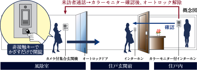 エントランスホールのオートロックは、簡単に解錠できる非接触キー対応。来訪者があった際には、住戸に居ながらTVカメラ付インターホンを介して映像と音声で相手を確認した上で解錠することができます。住戸玄関のインターホンでも、施錠したままで来客の音声確認が可能です。